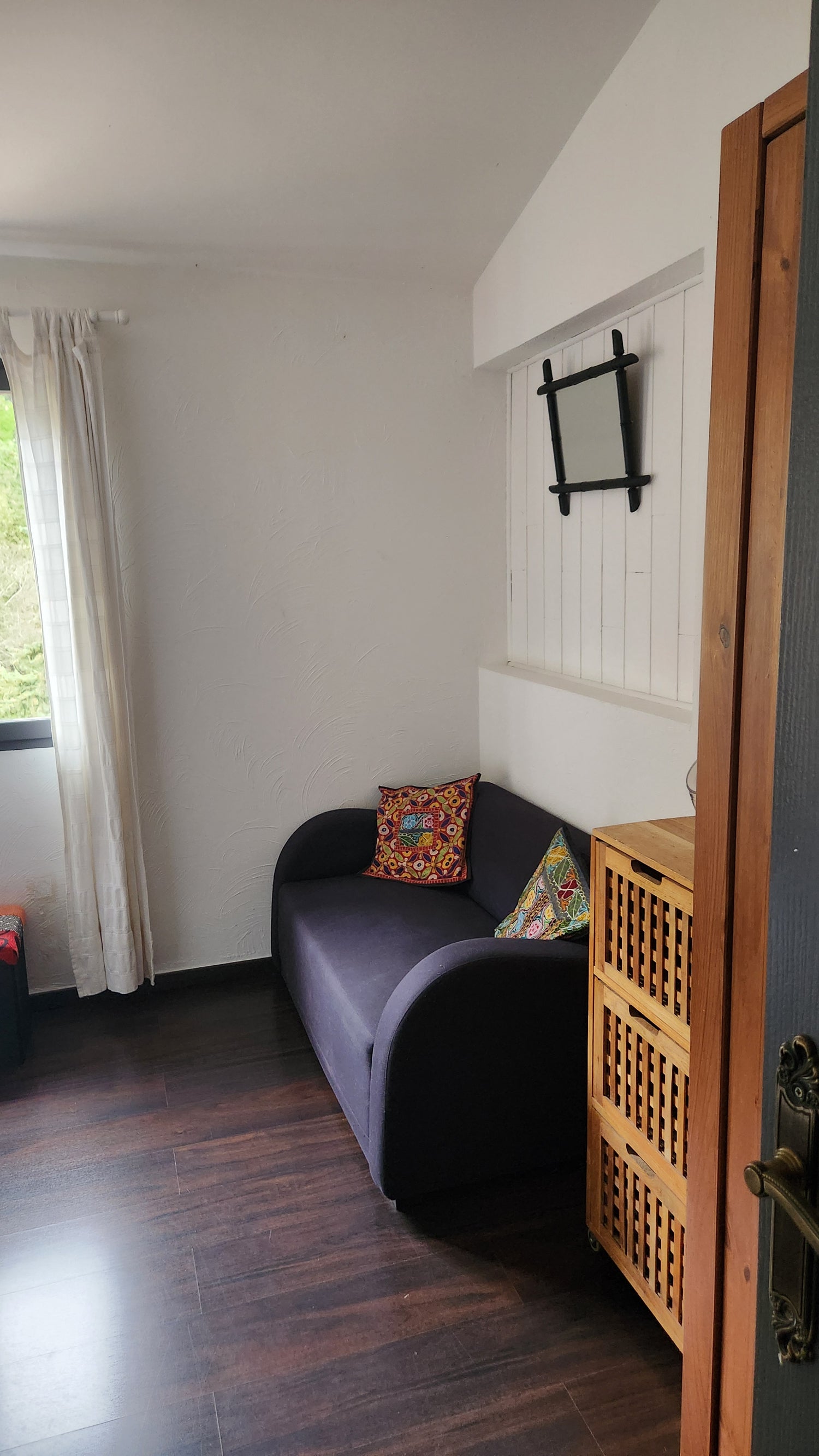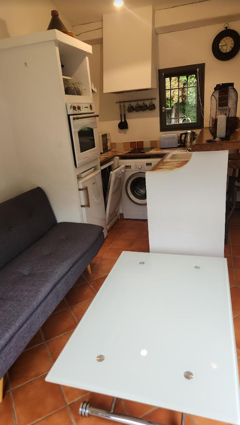 Tout d'abord une cuisine/salon complètement équipés (four, réfrigérateur, micro-ondes, lave-linge, lave-vaisselle, cafetière nespresso, grille-pain, bouilloire/T.V. avec box, fer et planche à repasser, canapé-lit 1 personne...)
